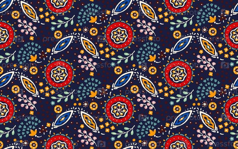 Бесшовный узор с фантазийными цветами, этнический вращающийся повторяющийся дизайн ткани и плитки, натуральные обои, иллюстрация завитка цветочного декора. Пейсли печатает рисованные элементы. Домашний декор