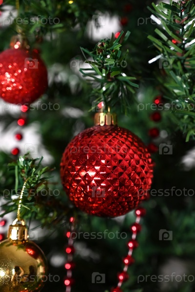 Рождественская открытка с игрушками, еловыми ветками и гирляндой. Декор сладостями, корицей