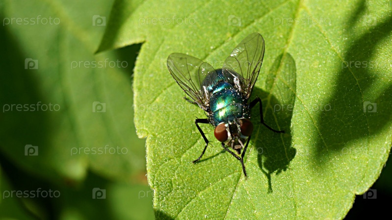 Синея муха сидит на листке