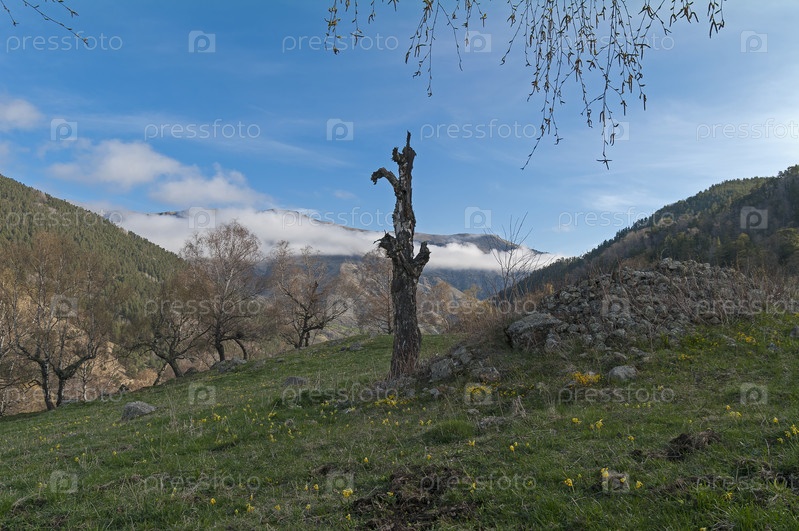 Весна в Кавказских горах. Долина реки Аксаут, Карачаево-Черкесия, Северный Кавказ, Россия. Солнечный день в начале мая