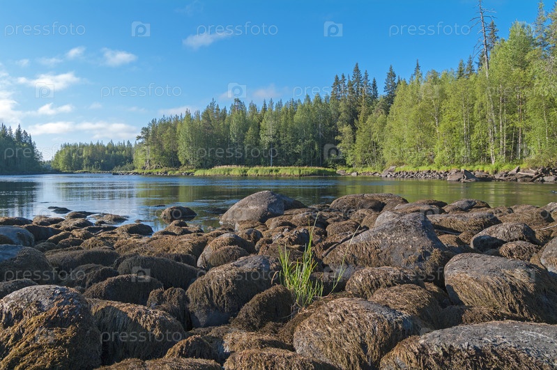 Низкий уровень воды на реке. Покрытые водорослями камни со дна оказались на воздухе. Река Чирко-Кемь, Кареия, Россия. Солнечный день в августе