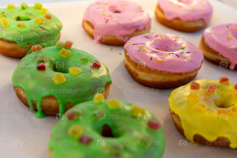 Свежий сладкий пончик в зеленой, желтой и розовой глазури на полке