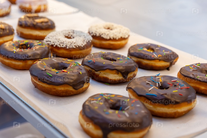 Свежий сладкий пончик в белой и шоколадной глазури на полке