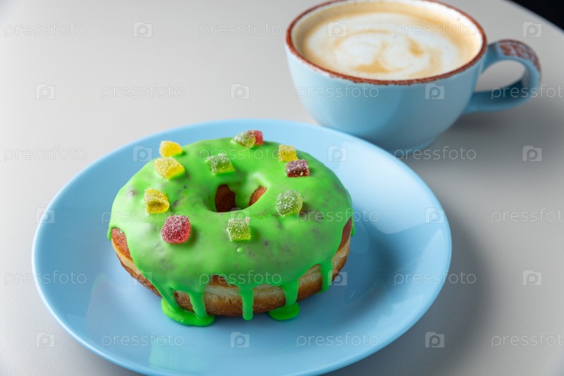 Пончик, покрытый розовой глазурью и разноцветным мармеладом на синей тарелке и чашке капучино