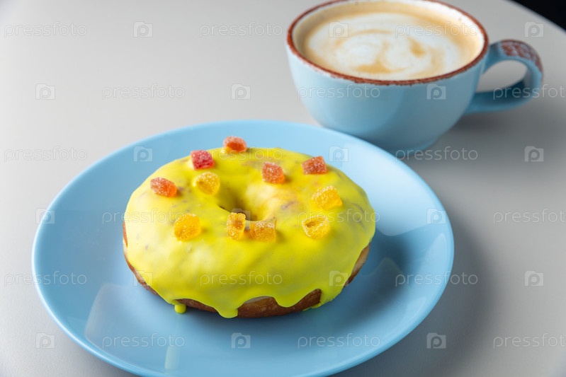 Пончик, покрытый желтой глазурью и разноцветным мармеладом на синей тарелке и чашке капучино