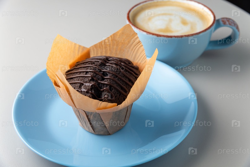 Шоколадный кекс на синей тарелке и чашка капучино с молочной пеной на белом столе, нормальный вид. Скопируйте место для вашей информации. Концепция завтрака