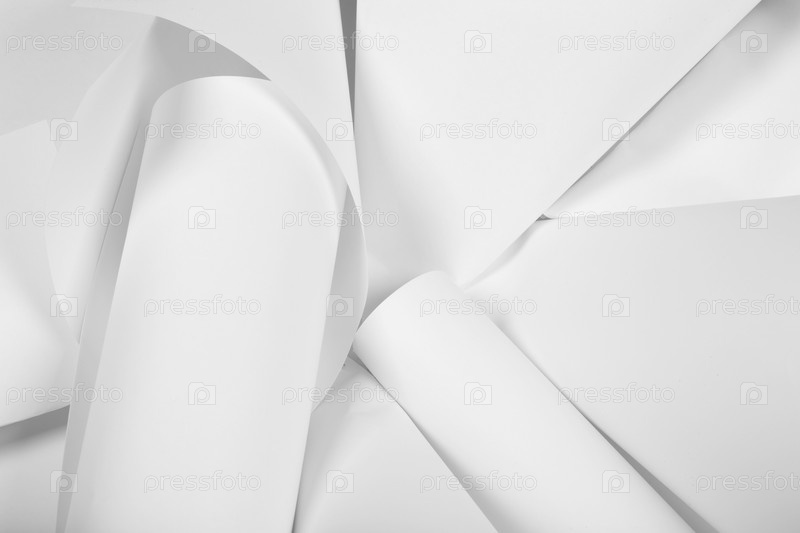 Белые листы офисной бумаги скручены и разбросаны. Бумажный белый абстрактный фон