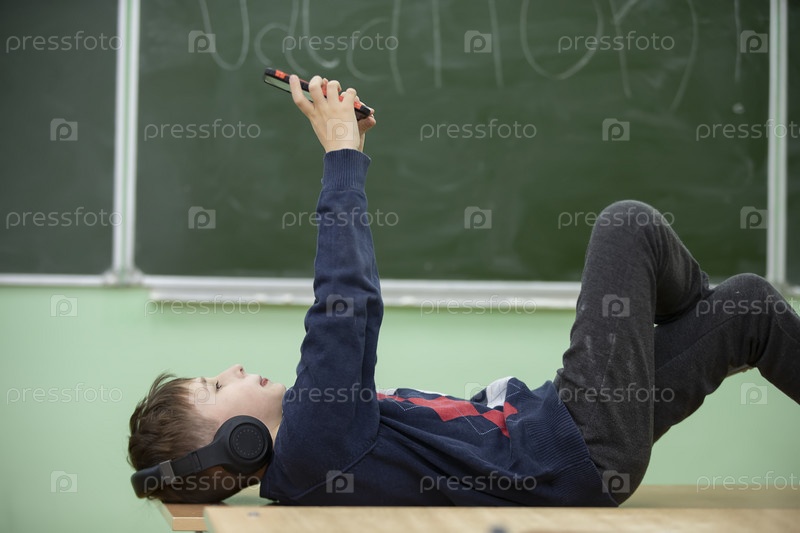Ребенок отдыхает в школе. Школьник лежит в наушниках на школьной парте и смотрит в смартфон. Переодеться в школе