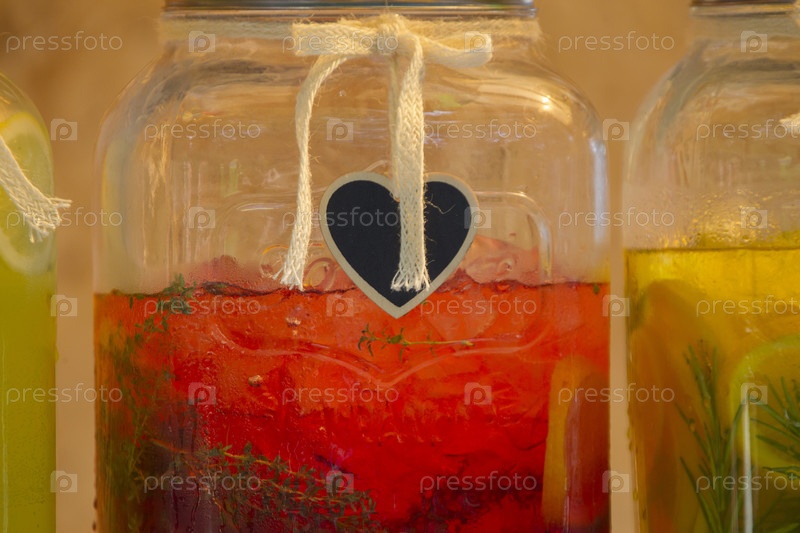 Стеклянные банки с разноцветным лимонадом. Яркие летние напитки с фруктами и травами