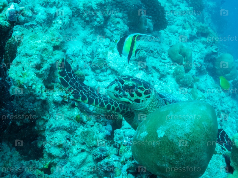Большая зеленая черепаха плавает в глубинах Индийского океана, Мальдивские острова