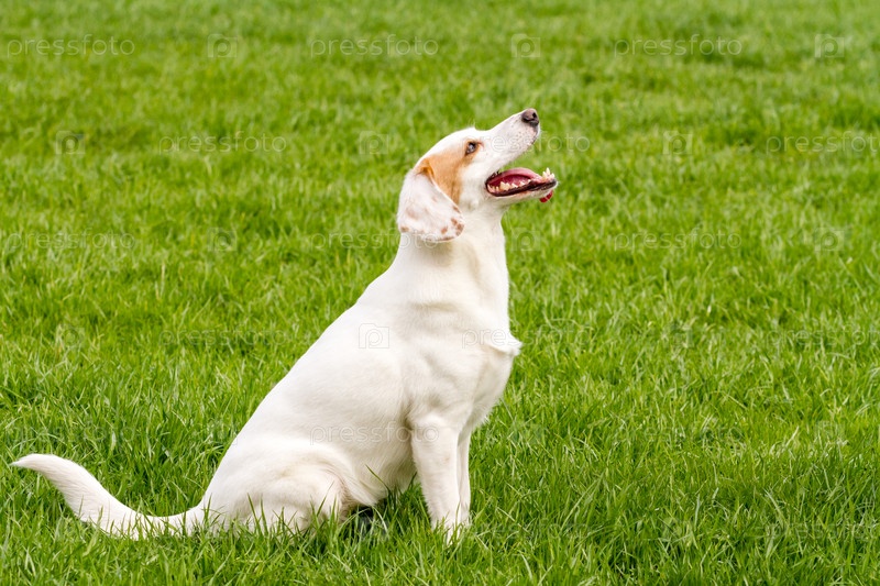Смешная белая беспородная собака с высунутым языком сидит на зеленой траве