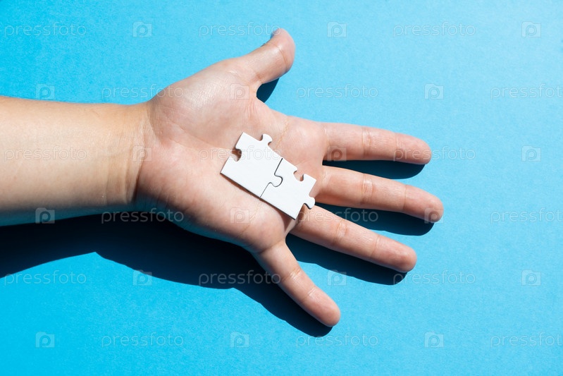Белые кусочки головоломки на ладони на синем фоне. Концепция настольной игры. Скопируйте место для текста, вид сверху