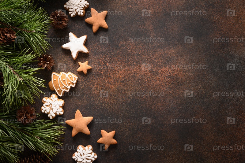 Рождественское домашнее ассорти из глазурованного печенья и рамы из ели и шишек на коричневом фоне. Новогодние праздничные угощения. Вид сверху. Рождественская открытка. Скопируйте пространство
