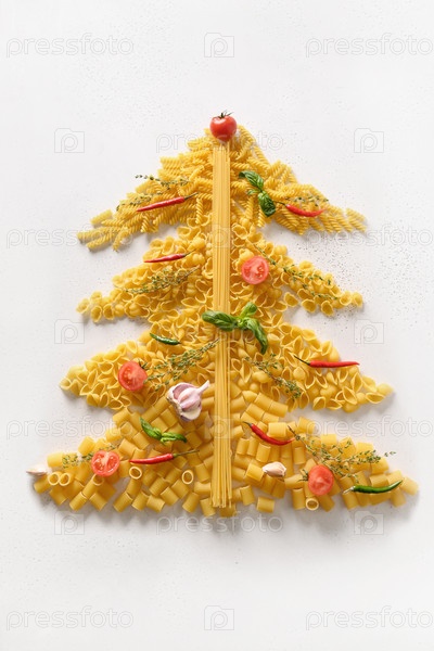 Альтернативная творческая рождественская елка из сухой итальянской пасты разной формы с помидорами и базиликом на белом фоне. Рождественская вертикальная открытка. Вид сверху. Концепция праздника еды