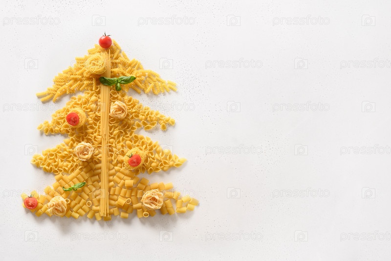 Альтернативная рождественская елка различной формы Итальянская паста с помидорами, базиликом на белом фоне. Рождественская открытка. Вид сверху. Концепция праздника еды