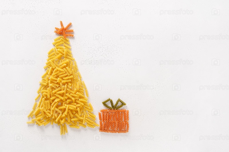 Альтернативная рождественская елка из сухих макарон, цветных фузилли с подарком на белом фоне. Поздравительная открытка с Рождеством с копией пространства. Вид сверху. Концепция праздника еды. Сделай сам для ребенка