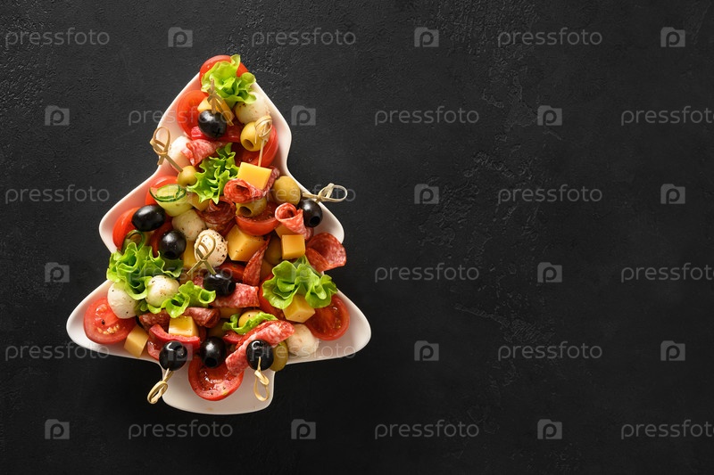 Праздничная закуска из канапе, помидоров, оливок, овощей, сыра моцарелла для праздничной рождественской вечеринки в тарелке в виде рождественской елки на черном фоне. Вид сверху. Скопируйте пространство