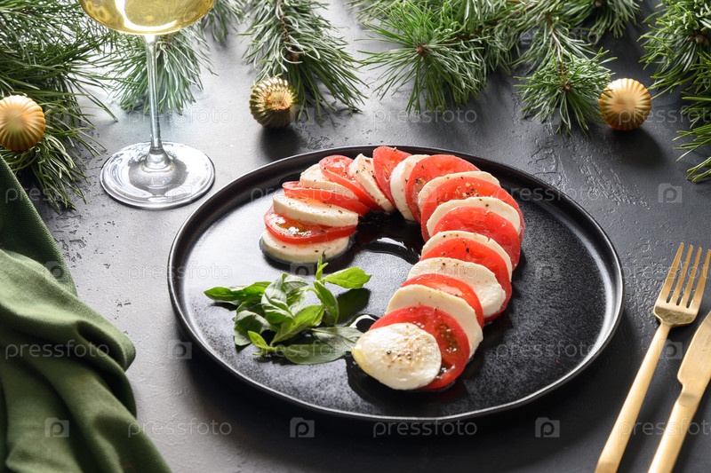 Рождественский салат капрезе подается как Candy Cane на черном блюде.Праздничная холодная закуска для праздничной рождественской вечеринки.Вид сверху