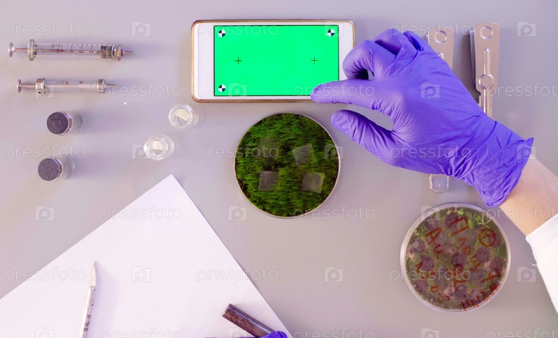 Ученый прокручивает смартфон с зеленым экраном