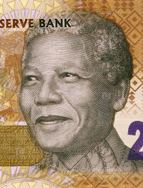 Нельсон Мандела (род. 1918) на купюре 20 рандов 2012 года из Южной Африки. Активист, революционер и политический деятель, президент Южной Африки в 1994-1999 годы