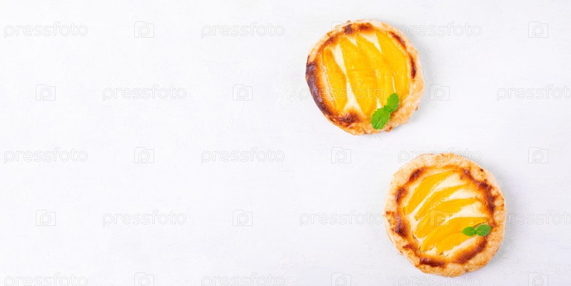 Веб-баннер с булочками из слоеного теста с ломтиками манго и рикоттой на белом
