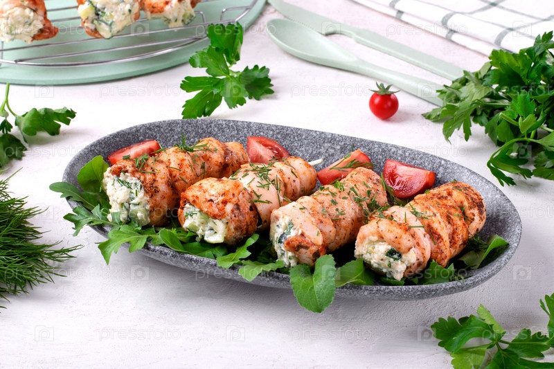 Куриные рулетики, фаршированные листьями салата, яйцом, сыром, огурцом и сметаной, подаются на серой тарелке. Горячее аппетитное блюдо