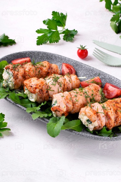 Куриные рулетики, фаршированные листьями салата, яйцом, сыром, огурцом и сметаной, подаются на серой тарелке. Горячее аппетитное блюдо