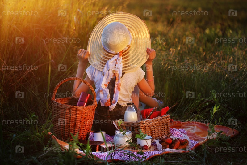Девушка в шляпе из мешковины сидит в поле на поляне