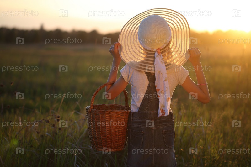 Девушка в шляпе из мешковины сидит в поле на поляне