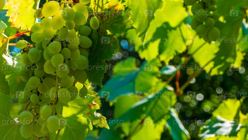 Спелый зеленый виноград в винограднике. Виноград зеленый вкус сладкий растущий натуральный. Зеленый виноград на лозе в саду