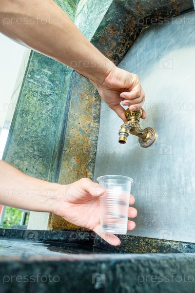 Наливание минеральной термальной воды в одноразовый стакан в бювете, крупный план