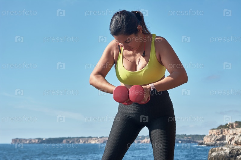 Латиноамериканская женщина средних лет, с желтой лошадью, черным легионом, с гантелями, гимнастикой, разогревается для тренировок, сжигает калории, поддерживает себя в форме, на открытом воздухе у моря, голубое небо, прекрасный день, солнечная зима, наушн