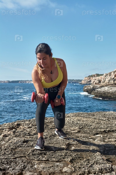 Латиноамериканская женщина средних лет, с желтой лошадью, черным легионом, с гантелями, гимнастикой, разогревается для тренировок, сжигает калории, поддерживает себя в форме, на открытом воздухе у моря, голубое небо, прекрасный день, солнечная зима, наушн