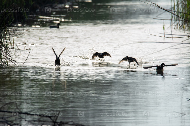 Обычная лысая, дикая птица в озере, с тростником и тростницей, спаривание ранней весной, естественная жизнь, Fulica atra,