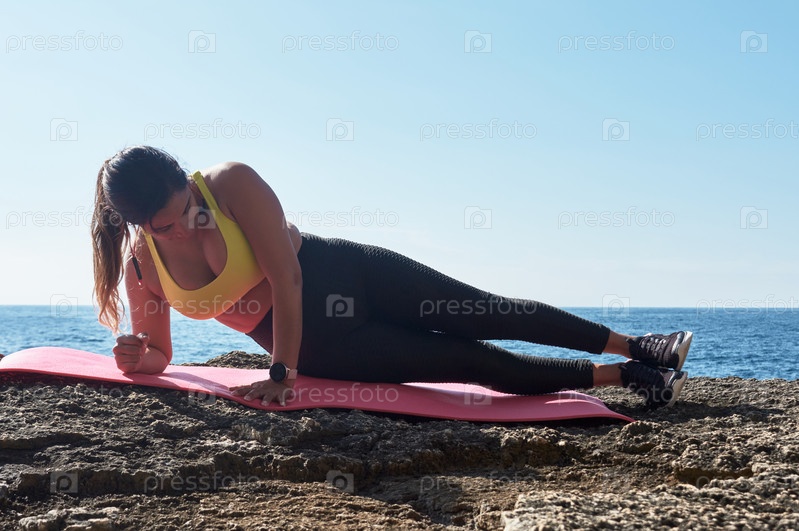 Латиноамериканка, средних лет, в желтом топе, черных leggings, тренировка, физические упражнения, планка, пресс, лестница альпиниста, сжигание калорий, поддержание формы, на открытом воздухе у моря, голубое небо, день, солнечная зима, Bluetooth-наушники