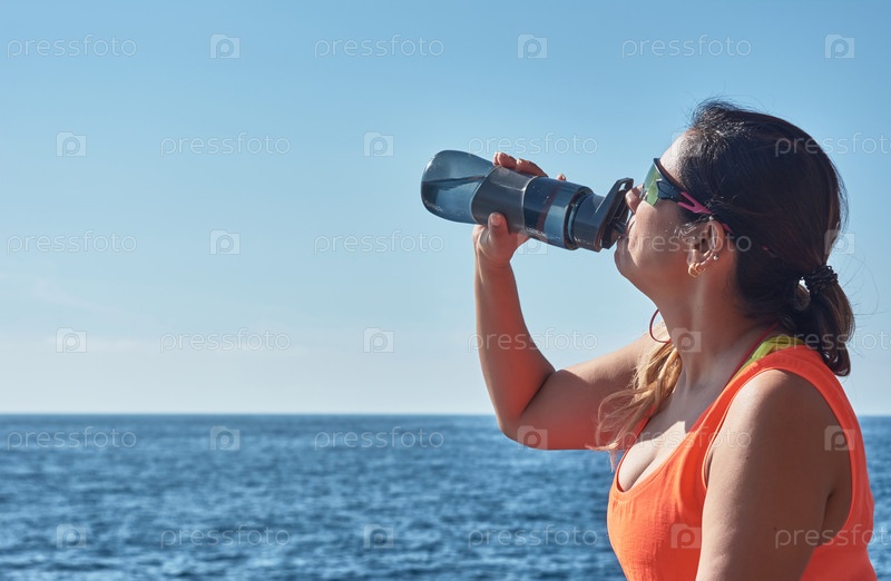 Латиноамериканка, средних лет, отдыхает, набирает силы, ест, пьёт воду, после тренировки в оранжевом топе, сжигает калории, поддерживает себя в форме, на открытом воздухе у моря, голубое небо, прекрасный день, солнечная зима, наушники Bluetooth и умные ча
