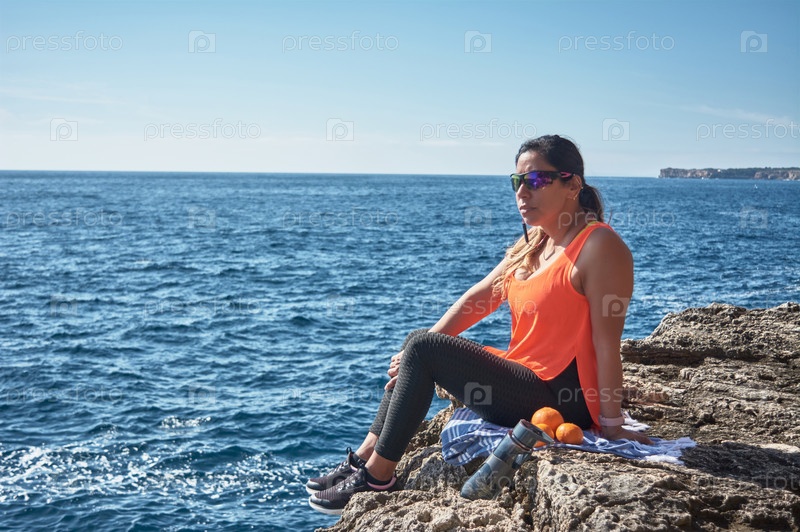 Латиноамериканка, средних лет, отдыхает, набирает силы, ест, пьёт воду, после тренировки в оранжевом топе, сжигает калории, поддерживает себя в форме, на открытом воздухе у моря, голубое небо, прекрасный день, солнечная зима, наушники Bluetooth и умные ча