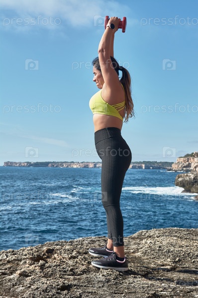 Латиноамериканская женщина средних лет, с желтой лошадью, черным легионом, с гантелями, гимнастикой, разогревается для тренировок, сжигает калории, поддерживает себя в форме, на открытом воздухе у моря, голубое небо, прекрасный день, солнечная зима, наушн