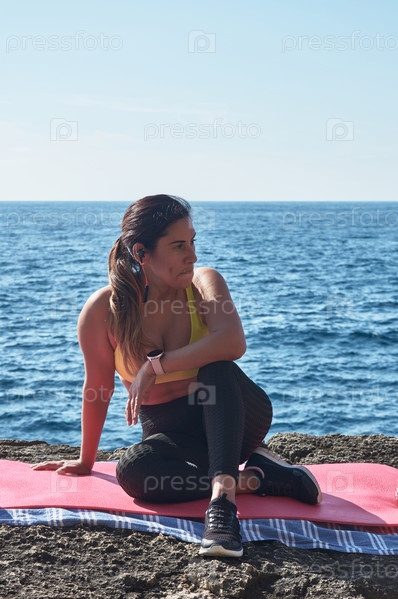 Латиноамериканка, средних лет, отдыхает, набирает силы, ест, пьёт воду, после тренировки в оранжевом топе, сжигает калории, поддерживает себя в форме, на открытом воздухе у моря, голубое небо, прекрасный день, солнечная зима, наушники Bluetooth и умные ча
