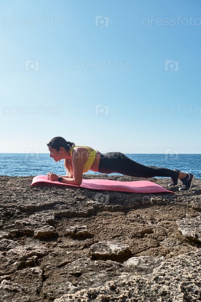 Латиноамериканка, средних лет, в желтом топе, черных leggings, тренировка, физические упражнения, планка, пресс, лестница альпиниста, сжигание калорий, поддержание формы, на открытом воздухе у моря, голубое небо, день, солнечная зима, Bluetooth-наушники