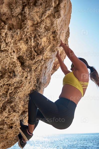 Латиноамериканка, средних лет, в желтом топе, черных leggings, тренировка, физические упражнения, планка, пресс, лестница альпиниста, сжигание калорий, поддержание формы, на открытом воздухе у моря, голубое небо, день, солнечная зима, Bluetooth-наушники