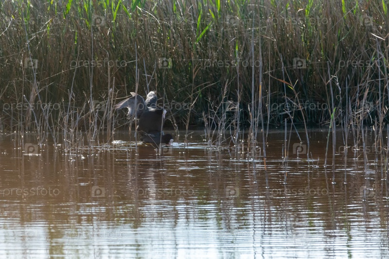 Обычная лысая, дикая птица в озере, с тростником и тростницей, спаривание ранней весной, естественная жизнь, Fulica atra