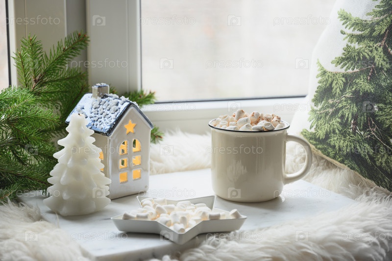 Зимний кофе с зефиром на подоконнике и меховой шкурой, украшенной еловыми ветками. Рождество