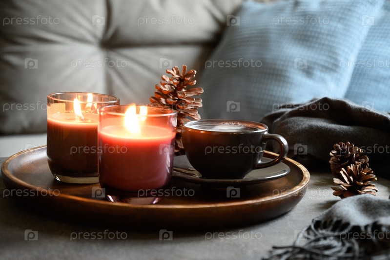 Чашка кофе, ароматические свечи подаются в деревянном подносе в уютном домашнем интерьере. Капризный. Зимние каникулы. Простой скандинавский домашний декор. Закрыть
