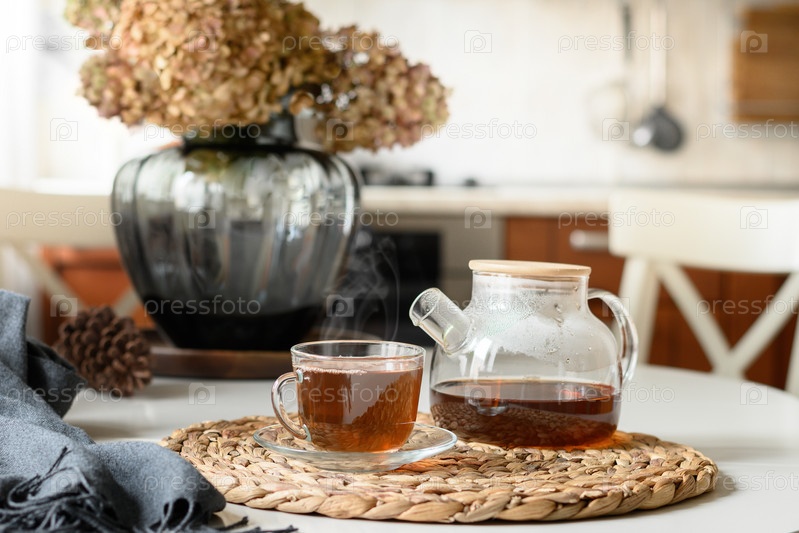 Чашка чая и стеклянный чайник на современной кухне. Натюрморт в домашнем интерьере. Закрыть. Чаепитие, уютная атмосфера