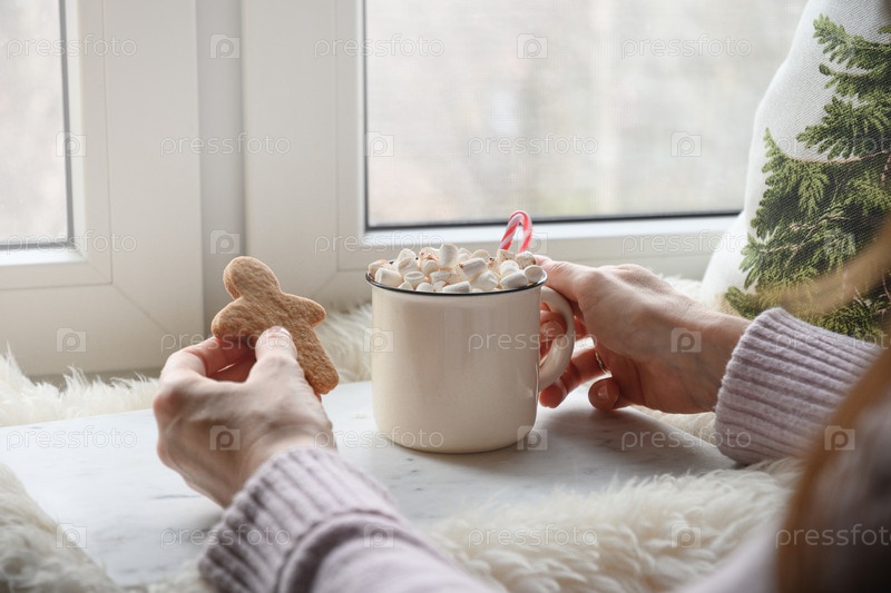 Женщина пьет кофе с зефиром и печеньем, пряничным снеговиком. Уютный зимний отдых