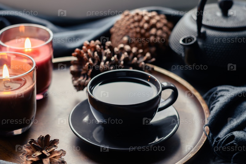 Чашка кофе, ароматические свечи подаются в деревянном подносе в уютном домашнем интерьере. Капризный. Зимние каникулы. Простой скандинавский домашний декор. Закрыть