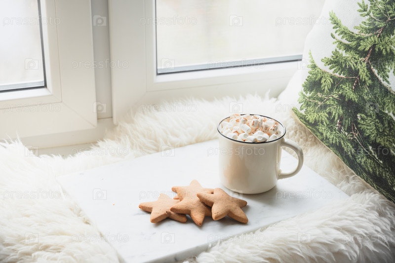 Зимний кофе с печеньем в виде звезд на уютном подоконнике с рождественскими вечнозелеными натуральными еловыми ветками