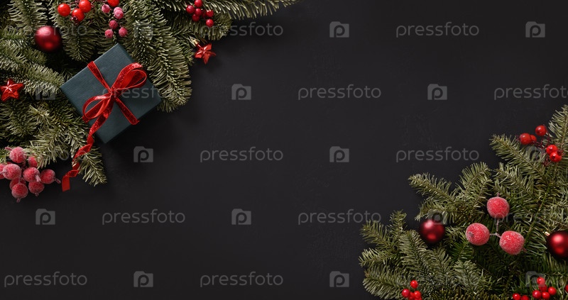 Рождественский зимний баннер с еловыми ветками, красные шары на черном фоне. Рождественская открытка