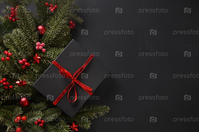 Рождественский зимний баннер с еловыми ветками, красные шары на черном фоне. Рождественская открытка